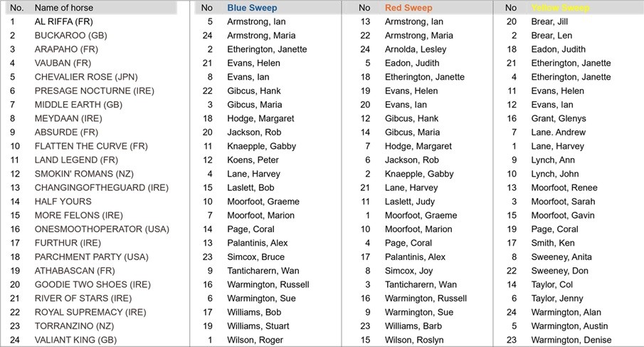 Last Wednesday night, Coral Page and I did the draw and paired up the numbers with everyone’s names in the sweep. The final field came out last night. You’ll find the horse names and numbers in the left column. Just match the number next to your name to see which horse — or perhaps donkey — you’ve ended up with!